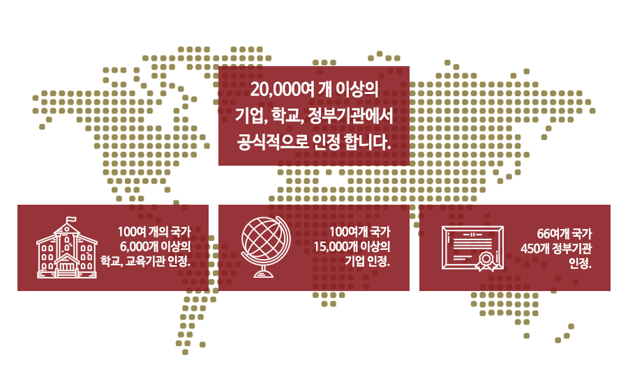 매년 400만명 응시하며 2만여개 이상의 기업 및 학교, 정부기관에서 공식적으로 인정하는 시험입니다.