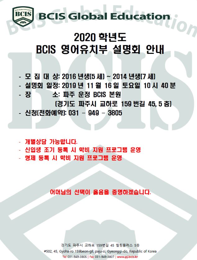 2020학년도 BCIS 영어유치부(영유) 신입생 설명회 안내(2019년 11월 16일 토요일)
